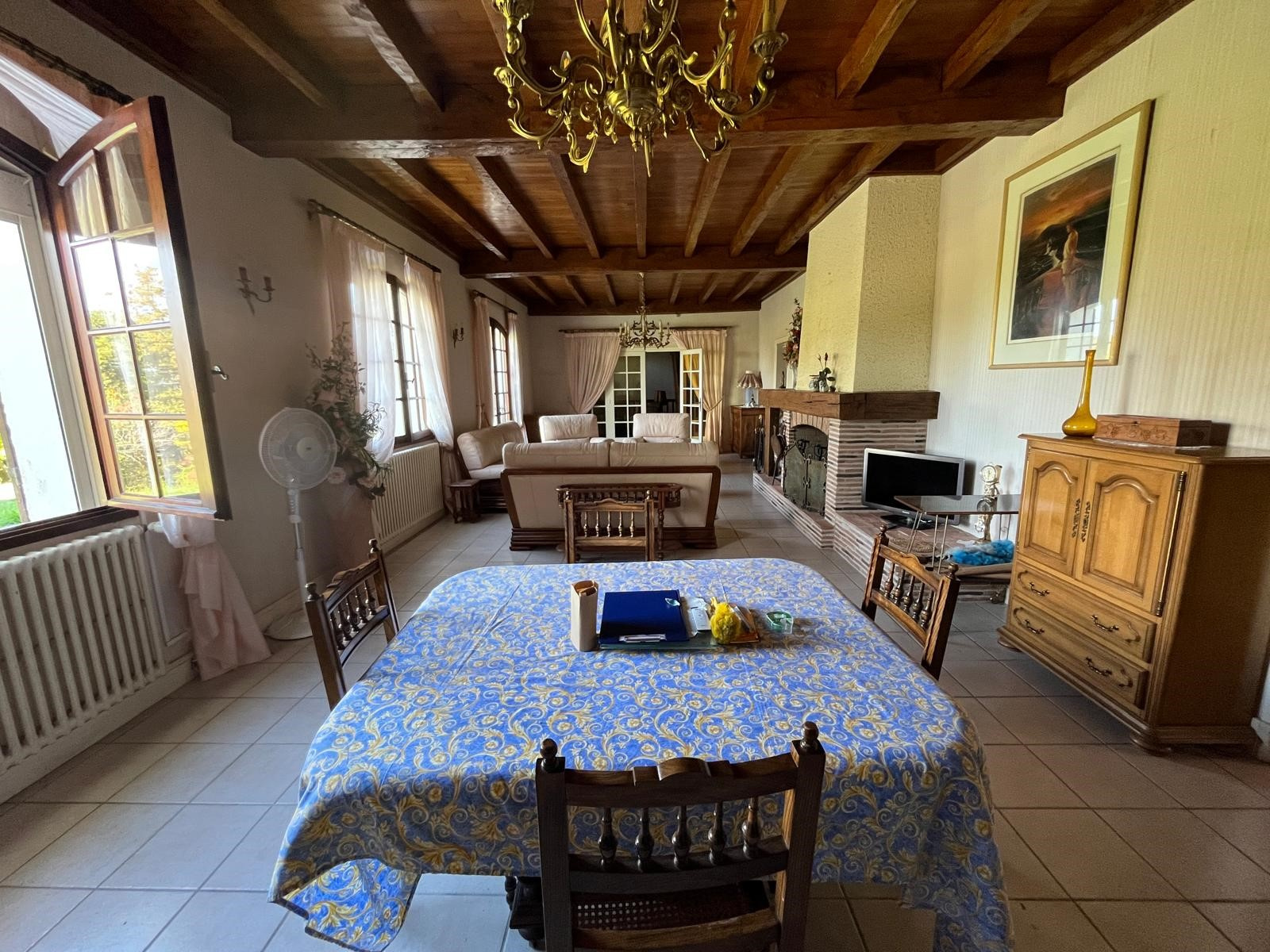 Sur le même niveau : Entrée/salon dans le pigeonnier, Grand salon-séjour avec cheminée ouverte et poutres apparentes, Cuisine indépendante meublée et équipée, Deux chambres dont une climatisée, Salle de bains avec WC et double vasque, Bureau, Salle à manger pouvant servir de chambre supplémentaire, WC indépendant, Salle d’eau dans le pigeonnier,